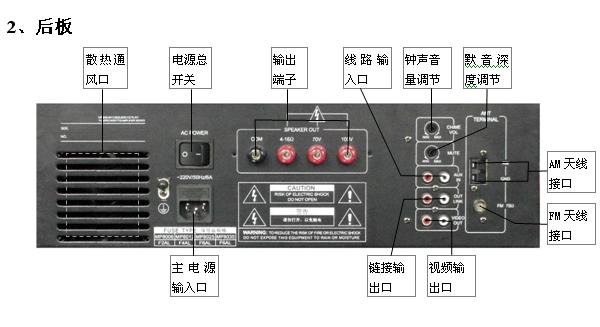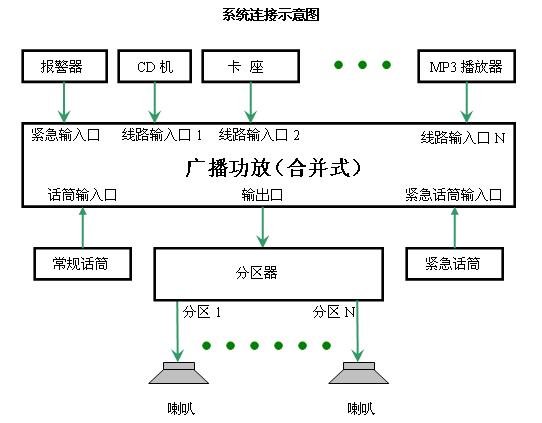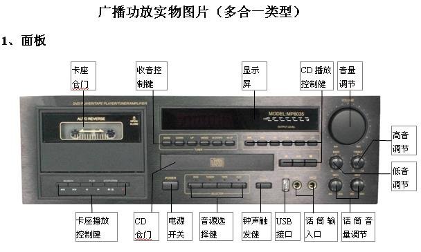 4、有些广播功放本身就带有分区输出、钟声输出或警报信号输出等功能,而一些广播功放更是将音源(CD、卡座、收音和MP3等)、定时、分区等功能集于一身,就如一个小型的广播系统一样,也称为多合一广播功放。