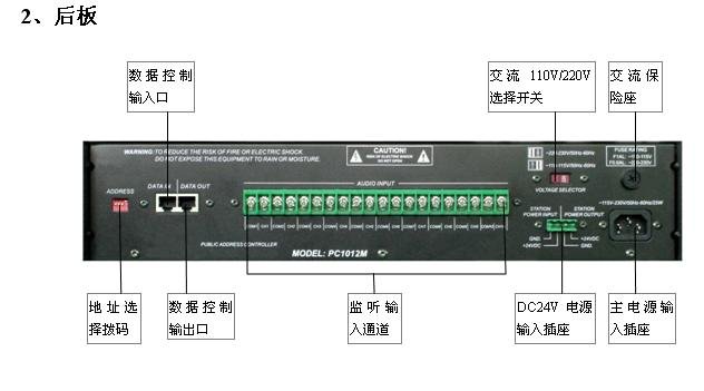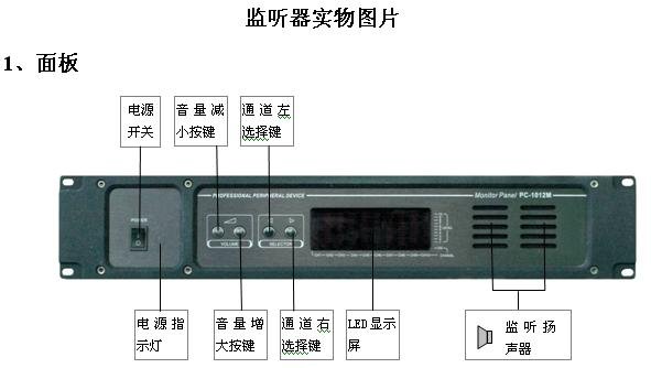监听器的主要作用是用于监听分区器的输出。监听器具有内置监听扬声器,且有多路监听输入通道(通常为十路),可分别与分区器的对应输出通道相连接,对分区器的各输出通道的输出状态进行监听。监听器有多路选择开关,可任意选择需要监听的通道进行监听,且监听的音量是可调的。监听器也可以直接与功放的输出通道相连接,对功放的输出状态进行监听。