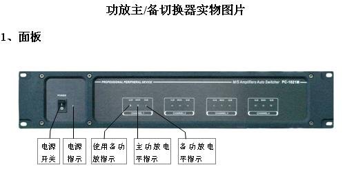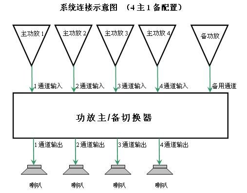 功放主/备切换器的主要作用是可实现在用功放(主功放)和后备功放(备功放)之间的自动切换。当一台功放在经过长时间使用后或其他的一些原因,导致出现故障而没有输出,在这种情况下,功放主/备切换器就能检测到主功放出现故障,并自动将信号通道切换到备功放上,且能做到切换时间非常快,以至听不到有声音停顿的现象。功放主/备切换器主要使用在可靠性要求较高的系统和场合,如学校用于考试的广播系统、有寻呼功能的广播系统以及有紧急广播的广播系统。目前比较流行的功放主/备切换器的配备方式有1主1备(1台主功放配1台备功放)、4主1备(4台主功放配1台备功放)以及6主1备(6台主功放配1台备功放)等几种。