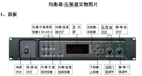 均衡器/压限器是广播系统用于改善音质的一种设备。众所周知,一套公共广播系统可能会覆盖许多不同结构和环境的区域,如某学校的广播系统就包含有教室、办公室、图书馆、食堂、地下车库以及室外操场等广播分区,这些分区的建声条件是不相同的,如果用相同频率特性的音源同时给这些区域广播,那么不同的区域就会有不同的音质效果,有些区域的声音可能会很难听,这时候就需要用均衡器/压限器来改变音源的频率特性,使各区域都能够得到好的音质效果。均衡器/压限器具有多个频率调节点,也叫均衡点(通常按1/3或1/2倍频程的规律来设置均衡点),每个均衡点的增益可独立调节,用户可以通过调节各均衡点的增益来获得自己满意的音质效果。均衡器/压限器还具有压限功能,其主要作用是将幅度过高的输入信号限制在容许的范围内,确保后面连接的功放不会过载。