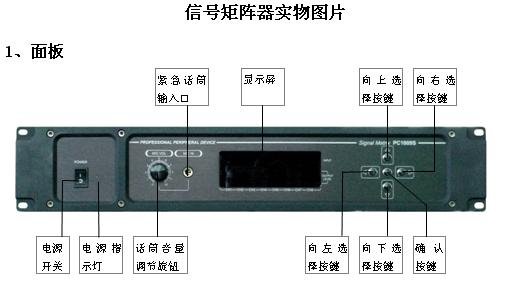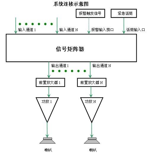 信号矩阵器顾名思义就是用矩阵的方式来分配音源信号的设备。信号矩阵器有多路(通常为八路)信号输入通道和多路(通常为八路)信号输出通道,每一路输入信号都可以任意地分配到任何一路输出通道上,而不会相互干扰和影响。信号矩阵器还有紧急话筒输入通道和报警触发信号输入接口,当报警触发信号输入接口的任一个通道有报警触发信号输入时,紧急话筒输入通道就会自动分配到对应的那一路输出通道上,使系统进入紧急广播状态。此外,信号矩阵器还带有远程控制数据接口,可以接受定时器的定时编程控制。