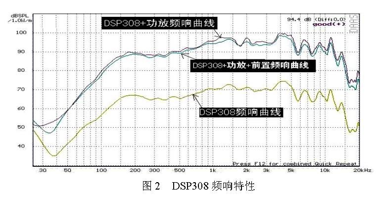 笔者通过对附表4 ~ 附表6中迪士普的3个型号广播扬声器,每个型号各5只进行了测试。每个型号测试分三种组合:1是广播扬声器单独测试;2是广播扬声器+广播功放MP2600测试;3是广播扬声器+广播功放MP2600+广播前置放大器MP9911P测试。测试发现,几种组合的频率特性都与广播扬声器频率特性很接近。图2是DSP308组合的测试曲线。由图2可以看出扬声器连接功放和前置后的频率特性变化不太明显。因此可以认为,在公共广播系统中频响范围是由广播扬声器决定的。