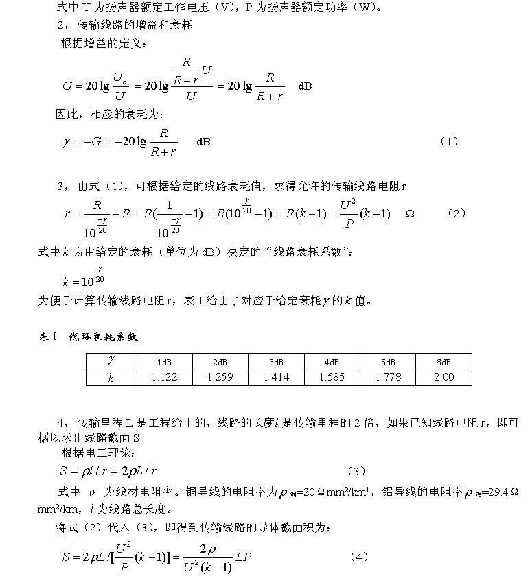 经验指出,当扬声器不是集中在线路终端,而是沿线均匀分布时,可大体认为负载集中挂在传输线路的中点,这时式(4)中的L可折半估算,其推导过程不再赘述。