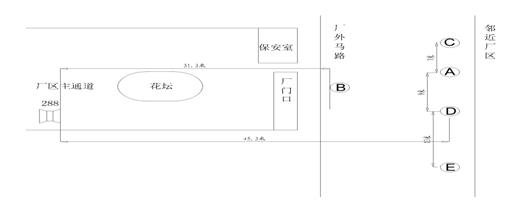 此次测试只对厂区主通道对面临近地区的影响进行测量。测量时,系统的工作状态与进行最大声压级的测量时一致。在厂区外,离厂门不同距离选几个不同的点进行声压级测量。选点以及各点的测量结果如下所示: