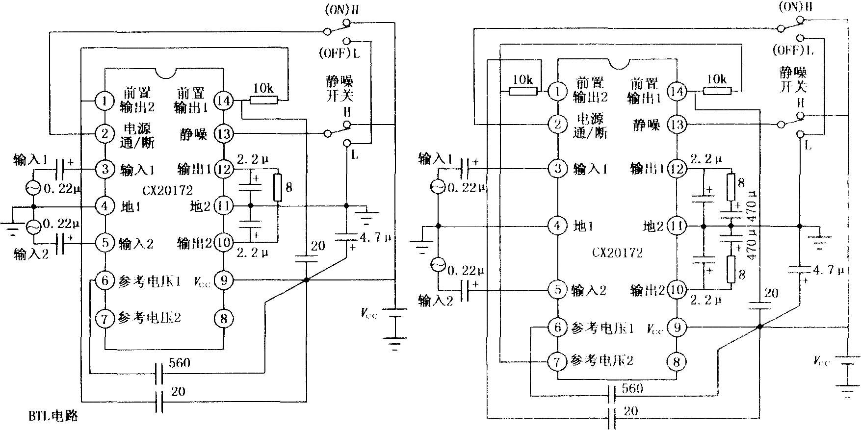 CX20172采用14脚双列扁平封装,工作电源电压范围为0.9~2.2V。在Vcc=1.5V、RL=8Ω、THD=10%时双声道工作,每声道输出功率为20mW,BTL连接时输出功率为80mW。电路内还设有静噪、电源通断功能。CX20172的最大电源电压Vcc=4.5V,允许功耗PD=560mW(TA=25℃)。如图所示为CX20172的典型应用电路。