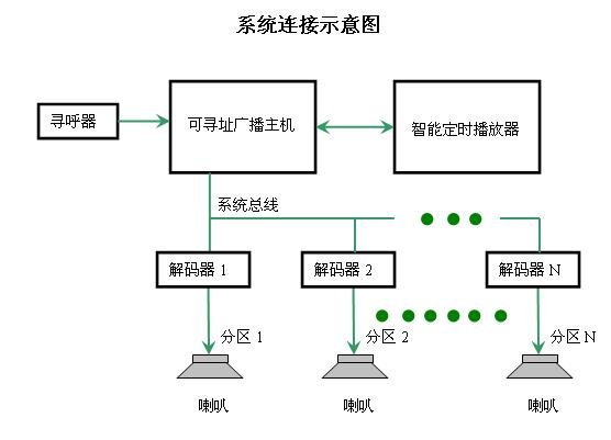 可寻址广播系统的特点是:它是总线型结构的系统,所有的分区(解码器)都挂在同一条总线上,各分区依靠地址编码来进行设定,而当分区规划变更时,只需要重新调整相应分区的地址编码即可,而无须重新布线。由于可寻址广播系统有这样的特点,因此它是各类学校中使用最广泛的一套广播系统。