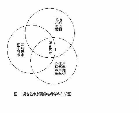 三度创作所须掌握的技能和知识包括对各种声音的产生、传播及声音属性的了解,掌握或熟悉电声技术设备的各种功能及应用知识,了解建筑环境对声音的影响,对来自于表演艺术中的各种声音信号进行放大、音质修饰和效果加工处理后,依所需的电平值加以混合、分配,用以输送给还音系统重放。其中,音质修饰、效果加工处理、电平值的混合、分配,是一种艺术再创作的过程,音响技术只不过是一种操作技能的表现手段,是调音师的部分技术技能。图1是调音艺术所需的各种学科知识的关系图。