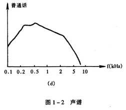 另外有的声谱是连续的,其谱线密密麻麻地连成一片。噪声及语言中的辅音都具有连续的声谱。例如图1 一2 ( d )是普通话语言的声谱,由于它是连续的,我们只划出它的包络(各条谱线顶点的联结线)。由普通话的声谱可见,说话的声音大概包含从100Hz 到5kHz 之间的振动,而主要的分量在300Hz 至3 kHz之间。顺便指出,蝉声大约包含500Hz 到20k Hz 压之间的振动,而交响乐则包含20Hz 到20kHz 压之间的振动,即交响乐的声谱散布于整个声频带。