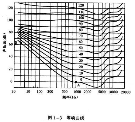 一般来说,在人类听觉的动态范围内,响度同声压级大体成比例,即声压级越大响度也越大。但这只对同一频率的声音来说是正确的。实验表明,声压级不是决定响度的唯一因素,另一个重要因素是频率。举一个极端的例子,频率极低的纯次声和频率极高的纯超声,无论其声压级有多大,我们都会觉得它“不响”。实际上,人们对2kHz至4kHz范围内的声音最敏感,而对低频声和高频声的感觉相对迟钝。图1 一3 表示响度同声级、频率之间的关系。图中的曲线叫做“等响度曲线”。该图的横坐标代表频率,纵坐标代表声级,而每一条曲线则代表一种响度。其中最低的一条曲线是响度为0 方的曲线。由该曲线可见,在1kHz处0 方对应于OdB 声级(图中A 点), 而在30Hz 处O 方却对应于约印dB 声级(图中B 点)。也就是说,对于30Hz 纯音,其声级需有60dB 才能引起O 方的响度感觉。由此可见,人类主观听觉的“频率响应”(简称“频响”)是不平直的,尤其是响度较低时。其中又以对低频声音的响应最为迟钝。不过,在图1 一3 中我们看到,响度为120 方的那一条曲线(最高的那一条)基本是平直的,这说明当响度很大时,频率的影响就不那么严重。