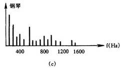 该声谱表明,这个声音仅仅包含1kHz的振动而没有其他成分,通常这样的纯音是由声学仪器发生出来的。图1 一2 ( b )是短笛某一音阶的声谱,它有许多条谱线,表明它是由多个频率不同的振动所形成,可见属于复音。复音中的每一条谱线称为一个分量。在复音声谱中,频率最低的分量称为基音分量,其余的称为泛音分量。一般地说,所有泛音分量频率都是基音频率的整倍数。图1 一2 ( C )是钢琴同一音阶的声谱,它也有许多条谱线,是一个复音,但其结构同短笛声谱显然不同。以上声谱都是离散的,即每条谱线之间有一定的间隔。