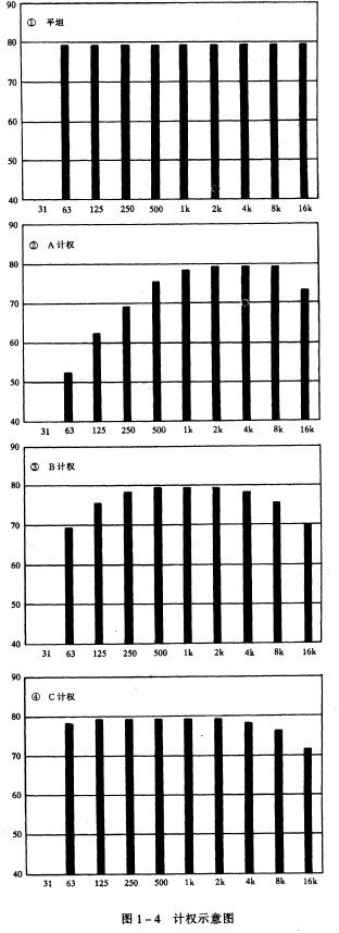 必要考虑到频率对响度的影响。为此,须对一个声音中不同的声频分量进行计权处理。常用的有三种计权规则,分别称为A 计权、B 计权、C 计权。A 计权是针对等响曲线中的低响度曲线进行处理,主要是考虑到低频分量和高频分量对响度的贡献较小,所以把它们所形成的声压级适当打一些折扣。例如,假设100HZ 分量的实际声级为50dB ,经A 计权处理后则把它当成20dB 来计算。B 计权是针对中等响度的等响曲线进行处理,这时也要对低、高频分量打一些折扣,不过其折扣比A 计权要小一些。C 计权是针对高响度的等响曲线进行处理,这时仅对高频分量打一些轻微的折扣,同平直规则相差无几。图1 一4 是对一个在声频带内均匀的声音进行计权处理的示意图。