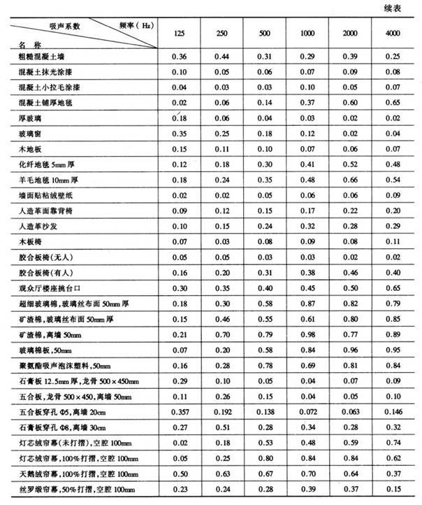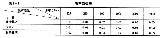 材料表面时,被吸收的那部分声能与人射声能之比的百分数叫吸声系数。室内常见饰面材料和厅室陈设的吸声系数见表1 一1 。表中的数据表明,吸声系数不仅取决于材料,还同声音的频率有关,尤其是对于那些比较疏松的材料。我们不打算在此讨论其中的机理,但不妨认为,这主要是由于材料的微细结构与不同的声波波长相比,有不同的相对尺度的缘故。空气也会吸声,不过其吸声系数较小,工程上常予以忽略。
