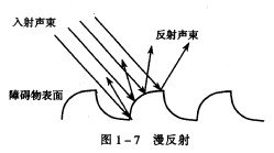 当障碍物的尺寸足够大,大到可以同声音的波长相比时,声音将会被反射。为了便于描述声音的人射和反射,通常我们用一条射线来代表声波,如图1 一5 所示。图1 一6 所示为声波被反射的情形。当障碍物表面凹凸不平时,如果凹凸的尺度小于声波的波长,则其反射特性同光滑面相似;如果凹凸的尺度能和波长相比,则反射线会散向四面八方,形成漫反射(或叫散射),如图1 一7 所示。