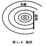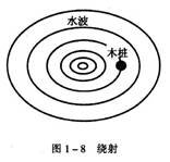 并不是所有的障碍物都会反射声音,当障碍物的尺寸比声音的波长要小时,声音将会绕过障碍物继续向前传播,这种现象叫“绕射”。大家知道,如果在水池中插人一根木桩,木桩是挡不住水波的,如图1 一8 所示;但如果在水池中设置一块足够大的挡板(如图1 一9 所示),情况就大不相同,这时我们看到挡板把水波挡住了。这是因为在水波传播的方向上,同波长相比,木桩的尺度很小,而挡板的尺度很大。我们可以在声场中做同样的实验。显然,一根木棍是挡不住声音的,足够大的墙壁才能挡住声音。由于声音是一种波,所以声音也会绕射。又由于一个声音通常包含很多频率不同(即是波长不同)的分量,因此,对于某一个障碍物,声音中的低频分量可能会绕射过去,而高频分量却可能被反射回来。这意味着声音的音色在某些障碍物的前面和后面会发生变化。因此,在配置音箱时要注意,小尺寸的障碍物对低音可能是无碍的,但对高音的防碍则
