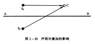 两个或多个声音在同一个区域内传播时,声音会发生叠加现象。声音的叠加并不是简单的加强。如果多个声音各不相同,人的听觉系统有从中选择某一个声音的能力,而其他叠加上去的声音则会成为干扰声;而如果它们是相同的,例如它们一个是原发声另一个是反射声,则叠加起来可能使声音加强也可能使声音减弱。当两个声波相遇时,如果它们的相位相同,就会互相加强;而如果它们的相位相反,则会互相抵消,从而使声音减弱;如果它们既不是完全同相也不是完全反相,则叠加之后可能有某种程度的加强,或某种程度的减弱,视其是接近同相或接近反相而定。至于声波到达声场某一点的相位如何确定,则主要取决于声音所经过的路程(声程)、时间延迟(时延)等因素。根据这种情况,两个声音叠加时,通常它们不会在声场处处相位都相同,或处处相位都相反。假定厅堂中有两个同样的声源S1 、S2,在不同的位置上同时发出相同的声音,如图1 一10 所示,则在对称线AB 上的所有点,两个声音的声程都一样,它们将会同相叠加,起到互相增强的作用;而在另一点C ,两个声音的声程(声波射线的长度)显然不同,如果它们正好相差半个波长,则它们将会反相叠加,互相抵消,这时C 点的声音减弱了,比单独一个声源发声时的声音还要小。根据数学原理,像C 点这样的反相叠加点,