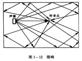 声音在室内传播时,会在天花板、地面和四壁发生多次反射。因此,身处室内的听音者除听到直达声外,还会听到多次反射声。图1-12 表示直达声和厅堂四壁部分反射声到达听音点的情形。显然,反射声所经过的路程比直达声长,经多次反射的路程更长。所以反射声比直达声来得迟,而且各次反射声延迟到达的时间也各不相同。厅堂越大,则反射声的延时间隔便越长。如果厅堂足够大,使得第一个反射声的延时间隔大于50ms~60ms,人们就会听到回声。不过能够形成回声的厅堂是很少的。当各次反射声的延时间隔小于50ms~60ms 时,人们会觉得它们同直达声连成一片,这些反射声除了起到增强直达声的作用之外,还会形成袅袅余音(或称“残响”)。这种现象叫做“混响”。适当的混响有加强和美化声音的效果,尤其是早期反射声对原发声场有很好的增强作用;