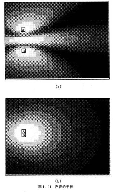 肯定不止一点,而会有无限多个点。这些点将会连接成为双曲线。图1 一11 ( a )为分别由A 、B 两个音箱发出的125Hz 的纯音叠加时声场的分布状况(图中白色部分为高声级区域,黑色部分为低声级区域)。由图可见,有的地方声音加强了,有的地方声音减弱了。两个声音叠加,使得声场中某些区域声音增强而某些区域声音减弱的现象,称为声音的干涉现象。作为对比,图1 一11 ( b )给出了把两个音箱叠放在一起放音的情形,这时两个声源近似重叠,声场处处都接近于同相叠加,几乎不发生干涉。由此可见,当用两个音箱分散配置放出同一个声音时,声场中会出现一些由干涉形成的“死区”。不过这是对纯音而言。当两个声源发出复音时,则由于复音中各分量的波长不同,因而在声场的同一个点,复音中的某些分量可能增强而某些分量可能减弱,从而就总体上来看,干涉现象将不明显。但对于频带较窄的复音,例如话音,则干涉现象仍不可忽视,在那些重要分量被衰减的