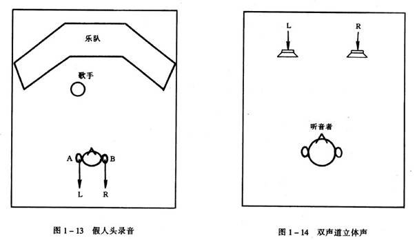理论和实践证明,为了在重放声中模拟两耳听音的差别,至少需要两个声道:一个左声道L 和一个右声道R 。这种具有两个声道的立体声系统就叫“双声道立体声”系统。图1 一13 为双声道立体声录音的一种模型。在原发声场中安置一个假人头,在其两侧设置了A 、B 两只拾音话筒,用来模拟人们的两耳。由A 拾取的信号称为左声道信号L ,由B 拾取的信号称为右声道信号R 。L 和R 显然是不同的,具有接近于两耳听音的许多差别。重放的时候,用头戴耳机,把L 信号送人左耳,把R 信号送人右耳。这样,就能够在很大程度上恢复原发声的立体感。由于听音者可能不只一个,头戴耳机也不舒适,变通的办法是用两只扬声器配置于听音者前方(如图1 一14 ) ,分别播放L 、R 信号。但这时不能完全保证L 信号只人左耳,R 信号只入右耳,重放声的立体感会较为逊色,不过实践证明还是可行的。