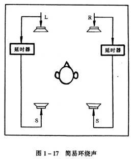 如图1 一17 所示,在双声道立体声的基础上,增加两个后置环绕声声道(s ) ,用L 、R 信号经过延时,衍生出后置声道信号S ,即可在一定程度上烘托出临场气氛。这便是所谓“双声道的四声道重放”。上述后置声道信号S 也可以用L 、R 信号经过移相衍生。显然,不论延时抑或移相,后置声道信号S 都是假的。所以被称为假环绕声。