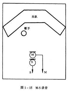 由假人头拾音得到的L 、R 信号虽然很接近于自然,但由于L 、R 两个信号差异的模式太多(即既有声级差又有时间差、相位差… 等等),在记录、传输、放大等过程中不容易进行无畸变的统一处理,所以现行的双声道立体声系统多采用另一种模型,其拾音方法如图1 一巧所示。图中使用了一只M 话筒和一只S 话筒,故称为M 一S 拾音。M 、S 两只话筒配置在同一个空间点上,但它们具有不同的指向特性。为了叙述方便,先说S 话筒。该话筒具有∞字型的指向特性,它对正前方和正后方来的声音都没有响应,只拾取左、右两侧来的声音;而且,当声音从左侧来时输出正信号,当声音从右侧来时输出负信号。所以S 信号相当于左右两侧的声级差,即