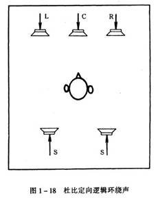 这是由杜比公司开发的一种系统。该系统用左前(Left)、右前(Right )、中央(Center )、环绕(Surrounding)四个声道拾音,得到L 、R 、C 、S 四个信号,然后经过编码,综合成LT 、RT两个信号记录在媒体(电影拷贝、磁带、光盘)上。重放时,由专用的“杜比解码器”解码还原出L 、R 、C 、S 四个信号,送人五个声道重放,如图1 一18 所示。在该图中,L 、R 两个声道是整个系统的主干,其作用与普通双声道系统相同。为了保证重放声场的质量,杜比系统要求该两声道的频响范围应不窄于20Hz ~16kHz (接近全频域)。中央(C )声道有三种可供选择的模式:“普通”(Normal)、“幻象”( Phantom )、展宽(Wide )。图l 一18 是按普通和展宽模式配置的。普通、展宽两种模式的差别存在于解码的过程中,其中普通模式的频带较窄(120Hz ~7kHz ) ,适用于家庭影院;而展宽模式的频带较宽(120Hz ~16kHz),因而质量也更高,适用于电影院。如果选用幻象模式,则无须设置中央(C )扬声器,解码器会把C 信号分配到L 、R 两个声道中,这时L 、R 声道除了担负原来的任务以外,还负责幻生出一个中央虚声源。两个后置的声道常被称为环绕声道;都用s 信号重放;也可以一个用S信号,另一个用反相的S 信号。S 声道信号是经过延时的,其延迟时间在15ms ~30ms 之间。为节约起见,两个S 声道的频带较窄(200Hz~7kHz),音箱的档次可以比另三个声道低一些。事实上,在电影院中,环绕声音箱不止两个,而是环绕观众后席均布着若干个,开销是很可观的。此外,有的杜比解码系统还从L 、R 、C 中分离出低音分量,以便驱动超低音(超重的低音)扬声器。