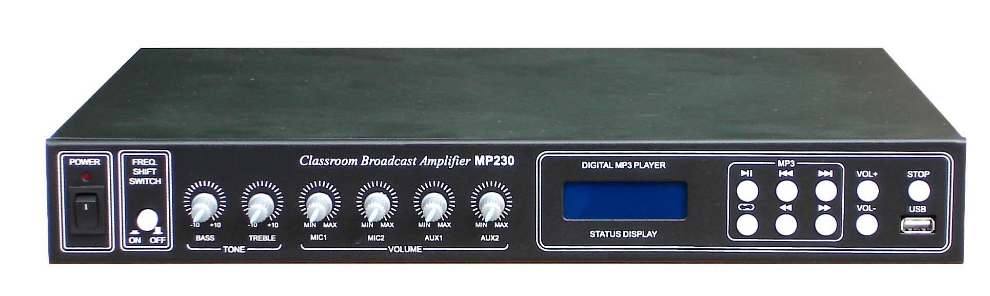 MP230是一部带有MP3播放器的专用教室功放设备。播放器的播放状态用轻触式按键操作,设USB接口,本机的USB接口能接受普通优盘、MP3播放器、移动硬盘、读卡器等存储器。本设备还有2个