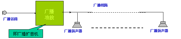 一个公共广播系统起码须配置下列环节:广播扬声器,广播功放,话筒。最简单的系统如图一。