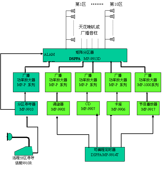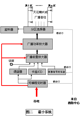 “最小系统”同最简单的系统相比较,主要是增加了分区环节、定时控制环节、警报环节和与消防中心联动的接口。平时,系统在可编程定时器的管理下自动运行,根据预先编定的程序定时启闭有关环节的电源,自动播放背景音乐,并按时播放作息时间正点钟声信号。当消防中心向系统发出警报时,通过联动接口强行启动有关环节(无论其处于何种程序状态);同时强行插入紧急广播(包括处于关闭状态的广播区)。其次,在该图中,功放和前置放大器以及音源设备也分开了,系统的组合、拆分、操控更为方便;另外还配置了监听器,以便监听系统的运行。