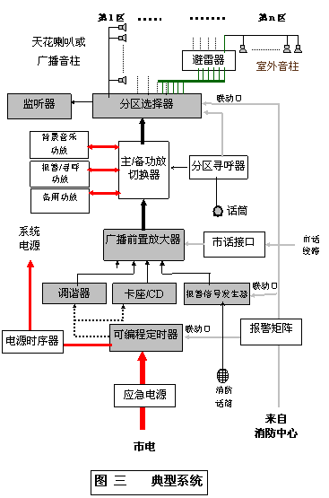 同最小系统相比,典型系统增加了报警矩阵、分区强插、分区寻呼、电话接口以及主/备功放切换、应急电源、避雷器等环节(填白的部分),系统的连接也作了相应的调整。
