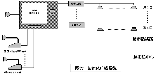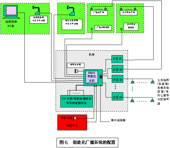 引入了像 MAG 这样的智能化主机之后,公共广播系统的构成将大为简化。典型的系统如图六所示。