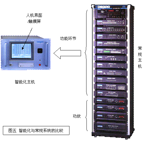 绝大多数智能化公共广播系统都是把系统置于一台通用的 PC 机的管理之下,由通用的键盘操控。系统中的其他环节仍然是常规的,只是添加了计算机接口。另一些更为专业化的系列,如迪士普的 MAG 智能化系列,则是由一台专用的主机(当然,也应是一台计算机)虚拟了系统中除功放以外的所有环节(包括音源播放环节),直接在主机屏幕上操控。图五示该系统同常规系统主机柜的外观比较。