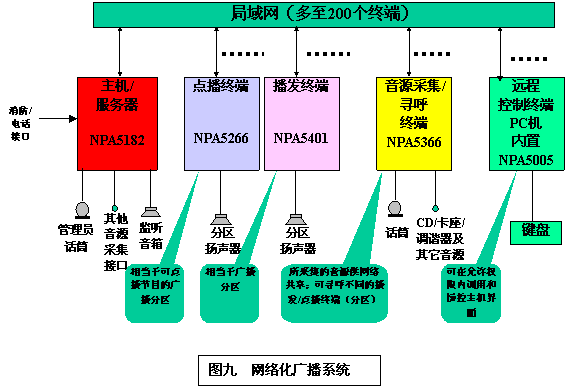 图九示一个网络化的公共广播系统。在该系统中,除主机(即服务器)外,有四种功能不同的终端。其中,播发终端相当于传统的广播分区,一个播发终端就是一个分区;点播终端也是一种广播分区,但具有点播节目的功能;音源采集/寻呼终端是外设音源的接口,其采集的节目可供全网共享;远程控制终端同智能化的远程控制终端相当。以上各种终端可以挂在网线到达的任何地方,所以安装、操控都十分方便和灵活。