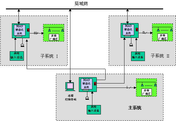 图八示数个智能化广播系统之间的互动。图中的子系统 I 和子系统 II 都被当作是主系统的一个分区,主系统通过作为远程控制终端的 PC 机对两个子系统进行调度。另外,各系统之间还可以通过电话接口和远程寻呼接口进行联络。