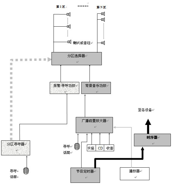 公共广播系统构成由节目源设备、信号的放大和处理设备、传输线路和扬声器四个部分组成。其原理如以下系统图: