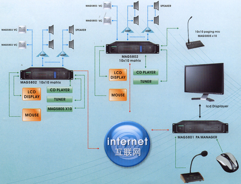 公共广播工程项目规模较大时,使用公共广播媒体矩阵典型系统是适宜的.各矩阵器的节目源可共享,由管理器自由分配.各矩阵器的寻呼话筒可寻呼任意其它矩阵器的分区.
