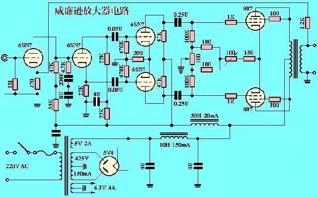 威廉逊(D、T、Williamson)电子管功率放大器于上世纪五十年代问世,发表在英国“无线电世界”杂志上,该功放首次将束射四极功率电子管改为三极管接法,使功放的保真度得到很大提高.是高保真三极管接法的创始看。当时的威廉逊功放为单声道电影,功放电子管采用KT66/6L6,其输出功率为12W,失真系数为2茗,频率响应20Hz~20kHz±1dB。