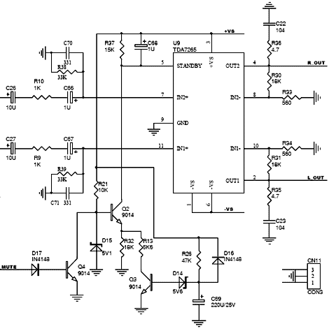 2,当5脚电压小于电源电压VCC-6V时进入正常状态.图中可用CPU控制MUTE端,达到静音效果。