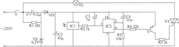 元器件选择 R1~R5选用1/4W碳膜电阻器或金属膜电阻器。 C1选用耐压值为400V以上的涤纶电容器或CBB电容器;C2~C4均选用耐压值为16V的铝电解电容器。 VD选用1N4007型硅整流二极管。 VS选用1/2W、6.2V硅稳压二极管。 V选用S9015或S8550、C8550型硅PNP晶体管。 VT选用3A、400V双向晶闸管。 IC1选用电视机用微型一体化封装红外接收头(使用时加罩或加半透明滤色片),IC2选用CD4024型7位二进制串行计数器集成电路。