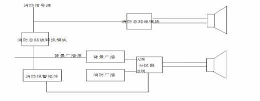 通过消防控制线送来的总路线信号由模块转换电压去控制电压继电器的切换动作 ,没有火警发生时播放背景或者业务广播,当发生火警时播放火警,通过消防系统进行疏通指挥人群;当背景和消防的喇叭不共线时我们可以采用如下方案如下图(以传统广播为例):