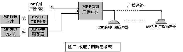 图一所示的简易系统只能发布语音广播,如通知、寻呼、讲话等。倘要广播背景音乐、广播新闻、发布录音,则可添置CD、卡座、调谐器(收音机)和节目播放器等设备。大多数广播功放备有多个线路输入接口,可以方便地同这些设备连接,系统的构成如图二。