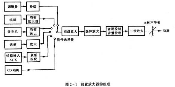 图2 一1 是典型的立体声前置放大器(Pre Amplifier )。因为立体声放大器的左、右通道完全相同,所以只画其中一路。