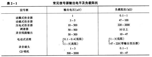 不同的信号源,不仅输出电平和要求与之匹配的负载各不相同,而且它们各自的频率特性也有很大的差异。因此,前置放大器必须根据各信号源的特性而给予相应的放大和阻抗匹配、频率均衡、甚至衰减,以保证不论选用何种信号源,都能达到所规定的输出电平和获得平坦宽阔的频率特性。一般要求前置放大器输出电压能达到0dB ,即0.775V 或1V 左右。表2 一1 为几种常见的信号源输出电平和负载阻抗。从表中可见,信号源的输出电平高至数百毫伏(如调谐器)甚至2V (如CD 机),低至1mV (如动圈式拾音头),相差悬殊。但我们要求前置放大器的输出无论对任何信号源都应达到1V 左右。因此,前置放大器对各信号的放大量就不应该一致。例如对lmV 的动圈式拾音头的放大就要1000倍(60dB ) ,而对200mV 输出的调谐器则只需放大5 倍(14dB )。