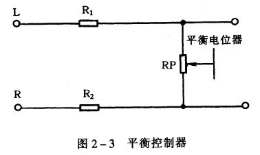 立体声平衡的简易控制,见图2 一3 。从图可见,通过对电位器RP 的调整可以使L (左)和R (右)声道的音量达到平衡。如果左右声道不平衡,人的左右两耳就会产生附加的声级差,从而使声像产生不必要的偏移,立体声的声像还原就会失真。在工程调试时,该调节器还便于人们独立调试左、右声道。把该调节器满调向左,便只有左声道信号;反之便只有右声道信号。