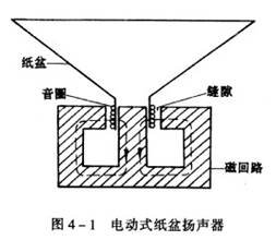 电动式纸盆扬声器,主要由电振动系统(纸盆、音圈和支架)、磁路系统(永久磁铁、导磁夹板和圆形芯柱)以及盆架等各种辅助性的零件组成。其结构见图4 一1 。
