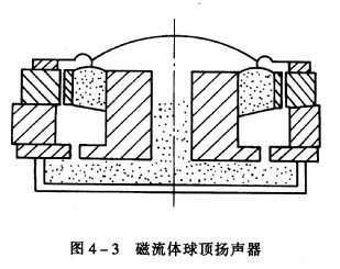 近年发展的磁流体(Magnetic Liguid )扬声器受到音响界的广泛注意。磁流体是一种特殊的液态载体和悬浮在其中的极小磁性微粒组成的油墨状液体(由四氧化三铁和二元酸脂油状合成物混合研磨而成),把它注入普通电动扬声器的放置音圈的磁隙中。当纸盆和音圈来回运动的时候,这种被扬声器磁路所产生的磁场“俘获”的粘稠流体就与音圈一起运动。如图4 一3 所示的磁流体扬声器(液磁喇叭)具有许多特点:它能使音圈自动定位于磁隙中心,简化了扬声器的结构。同时,磁流体能够把音圈的热传给周围金属而加速散热,从而提高了扬声器的功率容量(达2.5 倍)。磁流体还可以起阻尼作用,使某些频率的有害谐振减小,因而减少了重发声音的失真,也能使频率响应更加平直。