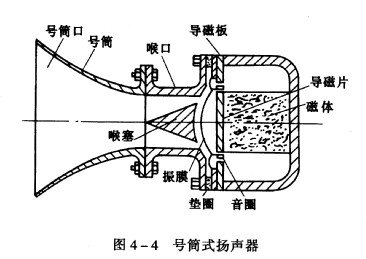 当前在大功率专业音箱中用得最多的是号筒式(Hom )高音扬声器,(达到直射式扬声器的数十倍)、可以制成恒定指向性和辐射距离远的优点。电动式号筒扬声器又名号角喇叭,它在工作原理上与电动式纸盆扬声器一样,但声音的辐射方式不同。纸盆扬声器是靠振膜(即纸盆)将声音直接辐射出去。号筒式扬声器则是振膜振动后,声音经过号筒再扩散出去。因此是属于间接辐射方式扬声器,结构见图4 一4 所示。