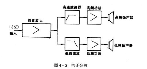 几种扬声器的组合是要用所谓分频电路来连接的。分频电路有两种形式,一种是电子分频方法,把分频电路插人在前置放大器和功率放大器中间,然后由独立的功率放大器分别推动高、低频扬声器单元,如图4 一5 。