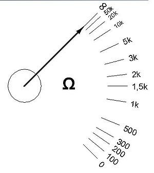 如上图,欧姆计的刻度表示从零至无穷大。当两个探针接触在一起时,电阻为零;分开时,电阻为无穷大。在这两个数目之间的广大数域,怎样表示出来?答案是以对数比例方式。所以,假设电池的电动势为6volt,想要设定电流为4mA,则内部电阻必须调整为1.5KΩ。当两个探针接触在一起时,总电阻是1.5KΩ,电流是4mA,欧姆计的显示针显示电阻为0KΩ。
