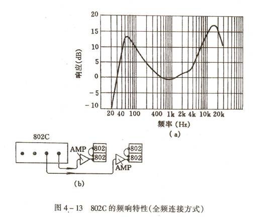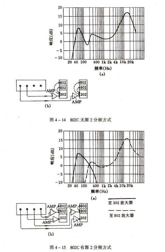 图4—13b显示一台802C控制两台功率放大器推动四只802音箱的正确连接方法。图4—15给出了用802C作电子(有源)2分频时的频响特性曲线和连接图。此时,每一个声道用一台功率放大器推动802音箱播放中、高频,另一台功率放大器推动302音箱播放低频,分频点为180Hz,此时802C控制器就兼有分频和均衡(频率补偿)的双重作用。如果随便选用其他型号的电子分频器来配合BOSE 802和302音箱,虽同样可构成2分频系统放音,但却由于缺少了频率均衡特性,则难以充分发挥802和302音箱的优异性能。