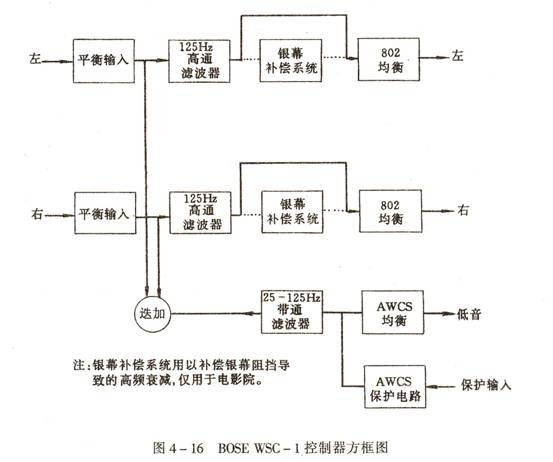 此外BOSE公司还生产有配合402型音箱、102型音箱和AWCS型低音炮等的专用控制器(参见表4—27,4—28,4—23)。以WSE—1控制器为例,它也是一套双声道的有源分频兼有源均衡器,是专门设计用于控制由802音箱和BOSE声波管系统(AWCS,俗称低音炮)两者的组合。WSC—1控制器的内部结构见图4—16,由图可见它包含了多个滤波电路、均衡电路以及低音炮的保护电路等。